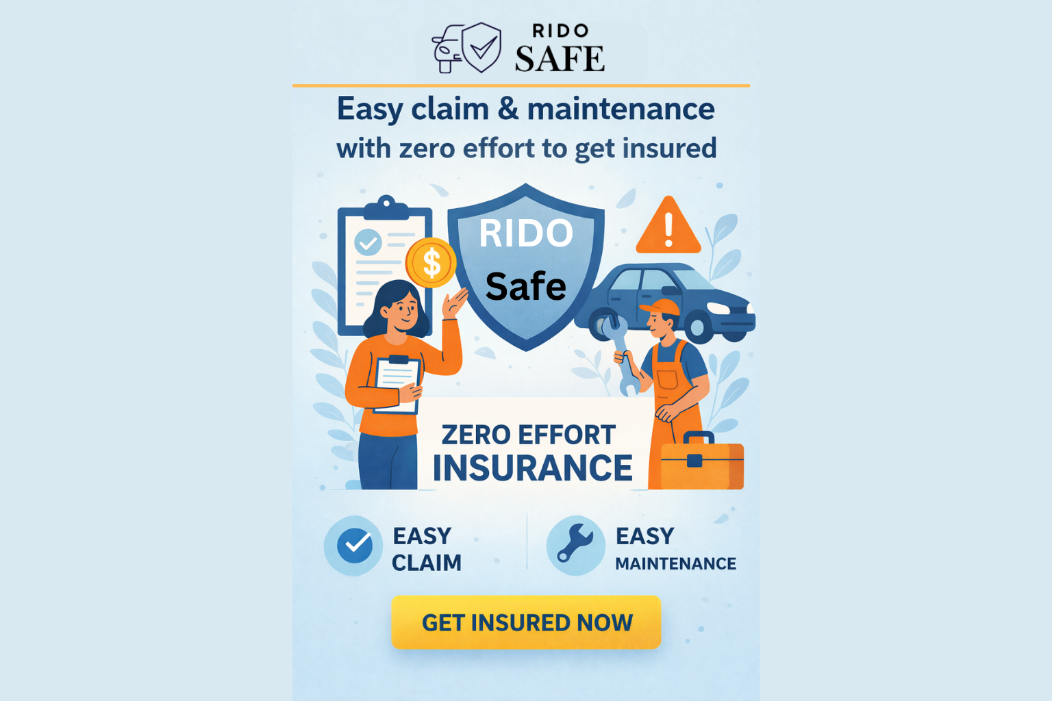 Rido Safe हमारे भरोसेमंद Rido Cabs परिवार की नई पहल है, जिसे आपकी जरूरतों के अनुसार सबसे बेहतरीन insurance समाधान प्रदान करने के लिए डिजाइन किया गया है। हमारा लक्ष्य सरल है — आपको और आपकी गाड़ी को सुरक्षित रखना, और वह भी त्वरित और परेशानी-मुक्त कवरेज के साथ।